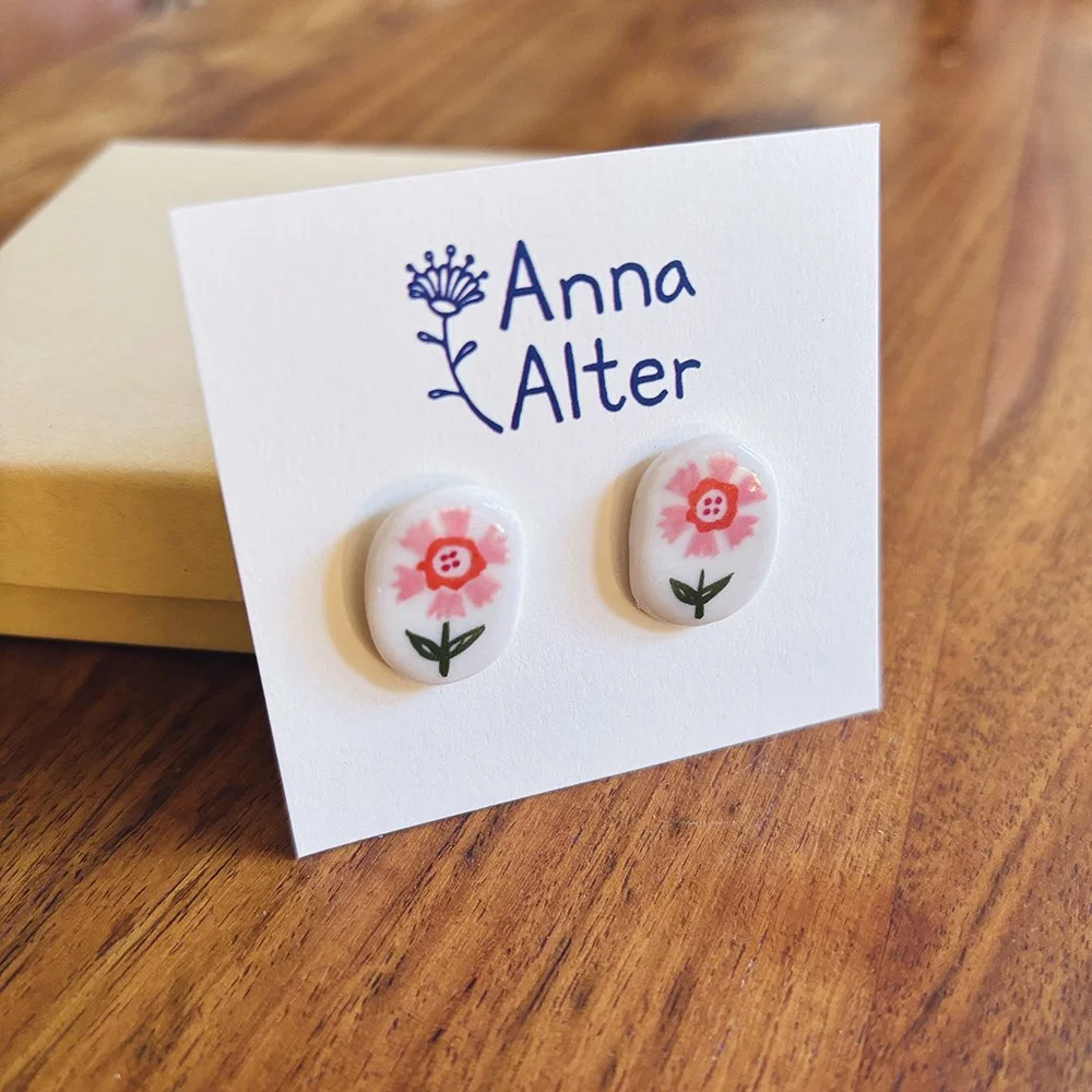 These are handmade, original earrings using porcelain clay. They are hand illustrated by Anna using underglaze and coated in a clear glaze. The posts are 18k gold plated.